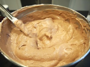 Remove 1 cup of the beaten egg whites and whisk it into the cocoa powder mixture to lighten it. To the remaining egg whites, gradually sift the flour mixture over the egg whites (about ¼ cup at a time) and gently but quickly fold the flour into the egg whites. I find a large metal spoon works best. Once you have incorporated the flour mixture into the egg whites fold in the cocoa powder mixture. (It is important not to over mix the batter or it will deflate.)
