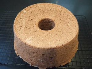 Immediately upon removing from the oven invert the pan. Suspend the pan by placing the inner tube on the top of a soda or wine bottle or onto a wire cooling rack. Allow the cake to cool for about 1½ hours.