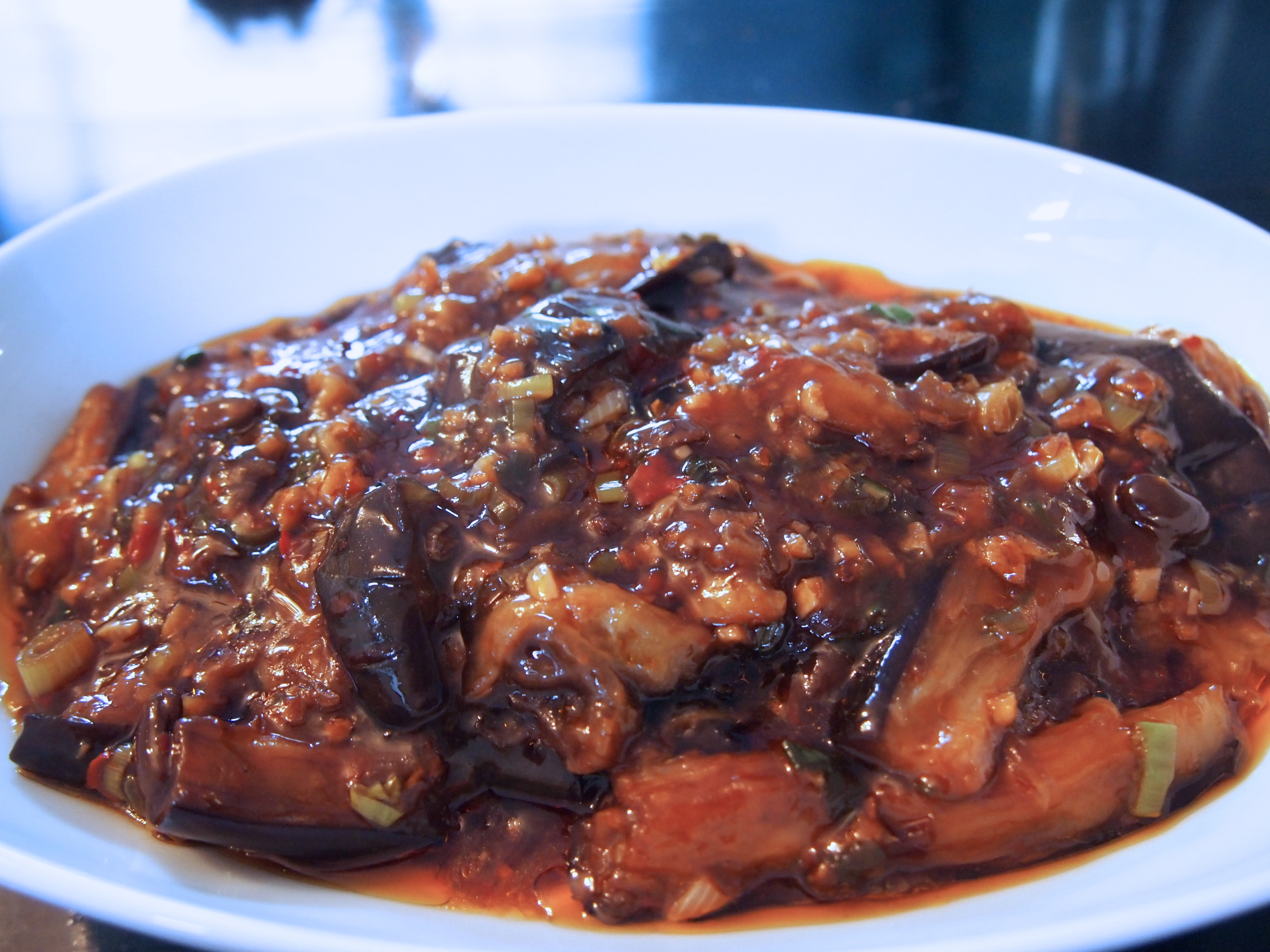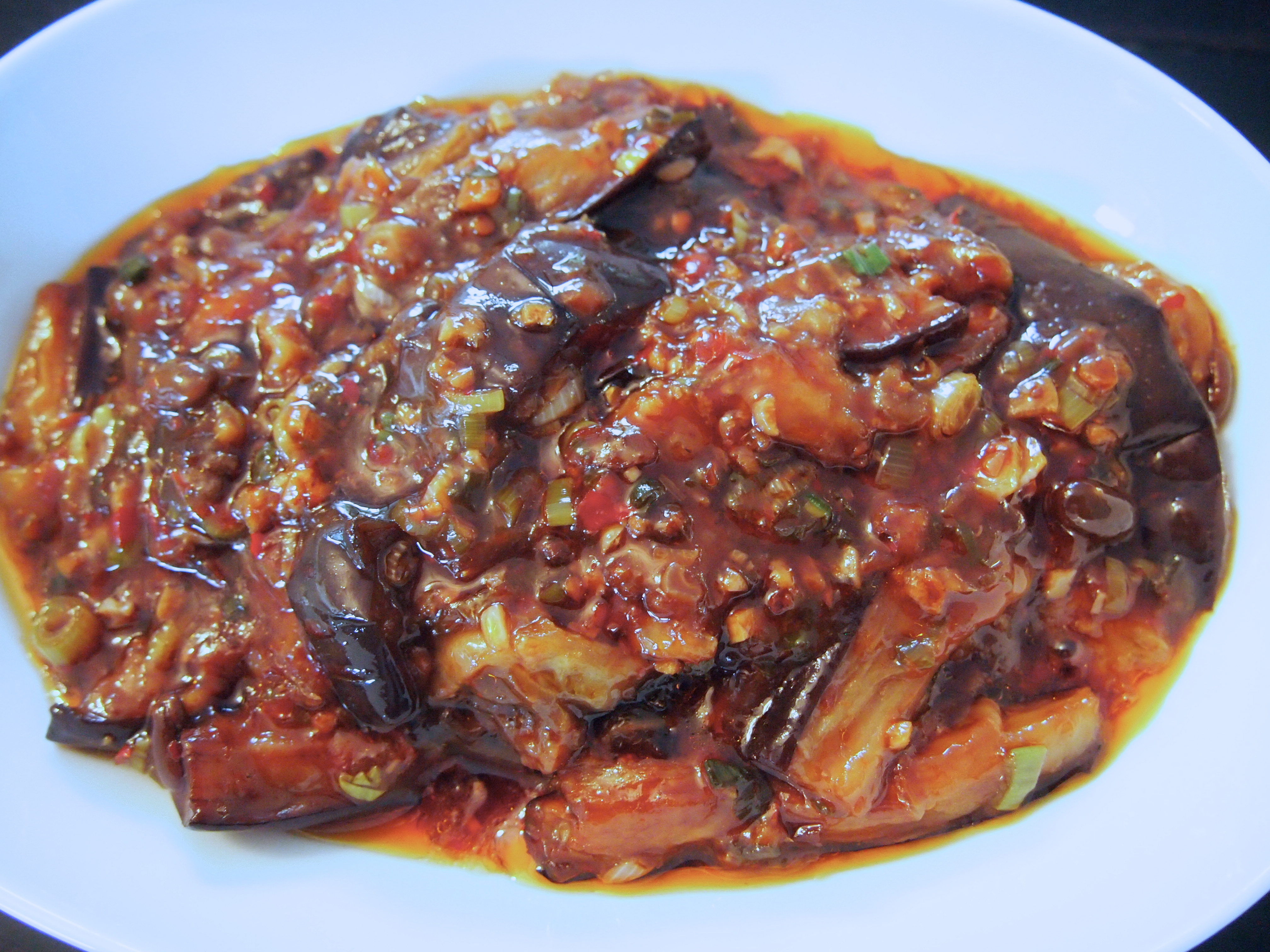 I adore eggplant and can’t get enough of it in any shape or form. A particular favourite is this Szechuan side dish which is normally referred to as eggplant with fish fragrant Sauce. Not the most appealing of titles but rest assured the recipe does not include any seafood; the term “fish fragrant” referring instead to the style of sauce that is most commonly served with seafood dishes. And what a sauce it is, full of strong flavours and aromas which make the eggplant really come alive. One key ingredient in the recipe is the Chilli Bean Paste or sauce. It really makes a difference and whilst you can substitute a different type of chilli sauce and still produce a memorable dish I recommend you go to your nearest Asian grocer and buy a jar of this as it imparts a wonderful vibrant red colour and a rich savouriness which is hard to replicate. Some recipes call for minced meat to be added to this braise but to be quite honest it’s savoury and full flavoured enough without it. Traditionally the eggplant is deep fried and if you use a wok you actually don’t need too much oil but you can also shallow fry the eggplant, although it may not hold its shape quite so well or retain it’s texture. Whilst I don’t like deep frying at home I find with eggplant it really is an easier option than shallow frying. Eggplants are like a sponge when it comes to oil and I find you use an awful lot of it when you shallow fry, with all the oil being absorbed by the eggplant whereas when it’s deep-fried I find the eggplant absorbs much less oil.