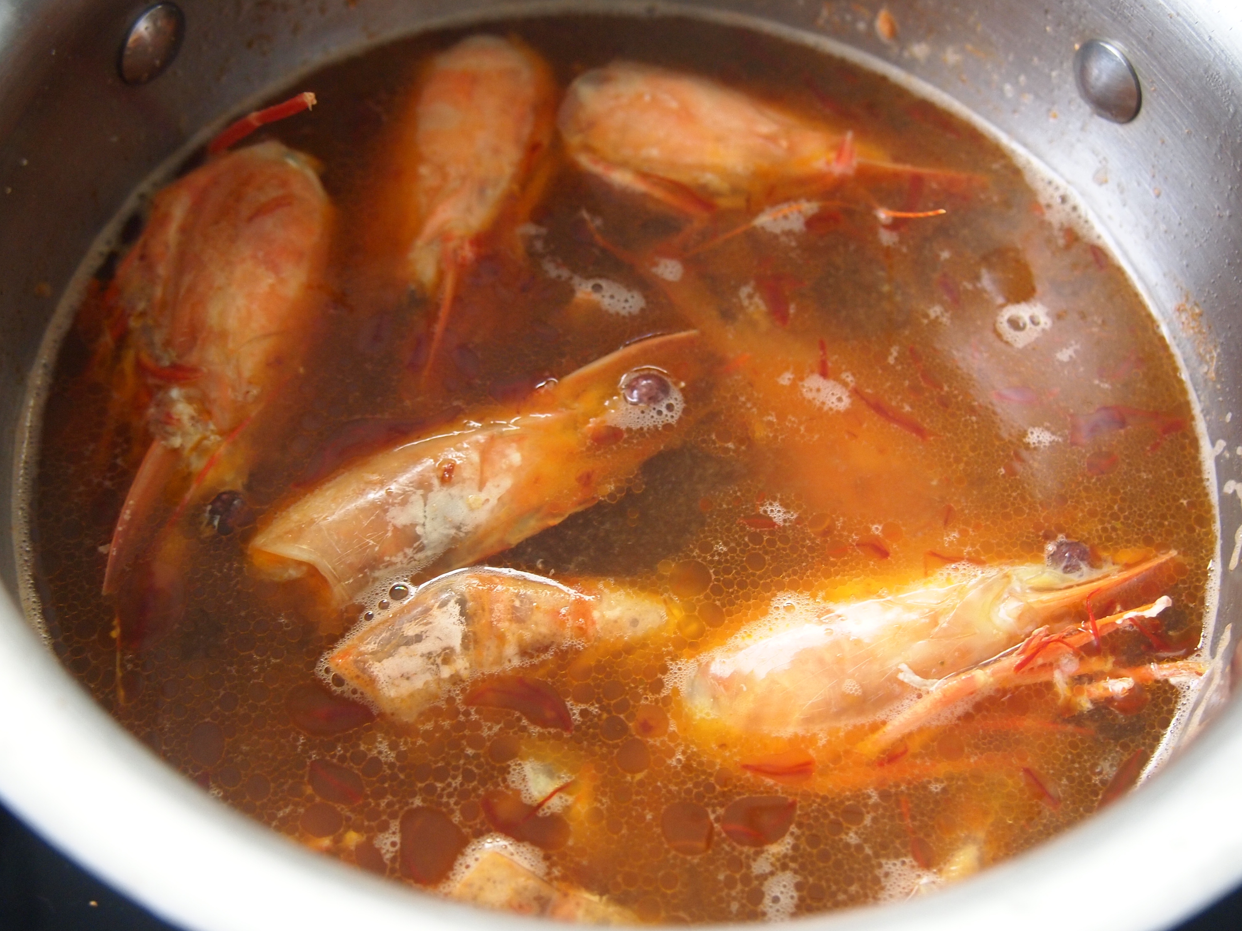 To make the stock, heat a about a tablespoon of olive oil in a medium size saucepan and when hot add the reserved prawn shells and heads. Cook stirring and pressing down hard on the shells and heads for a good few minutes. Add a pinch of salt, some freshly ground pepper and the saffron. Stir again then add the stock and bring to a boil. Lower the heat and simmer covered for 30 minutes.