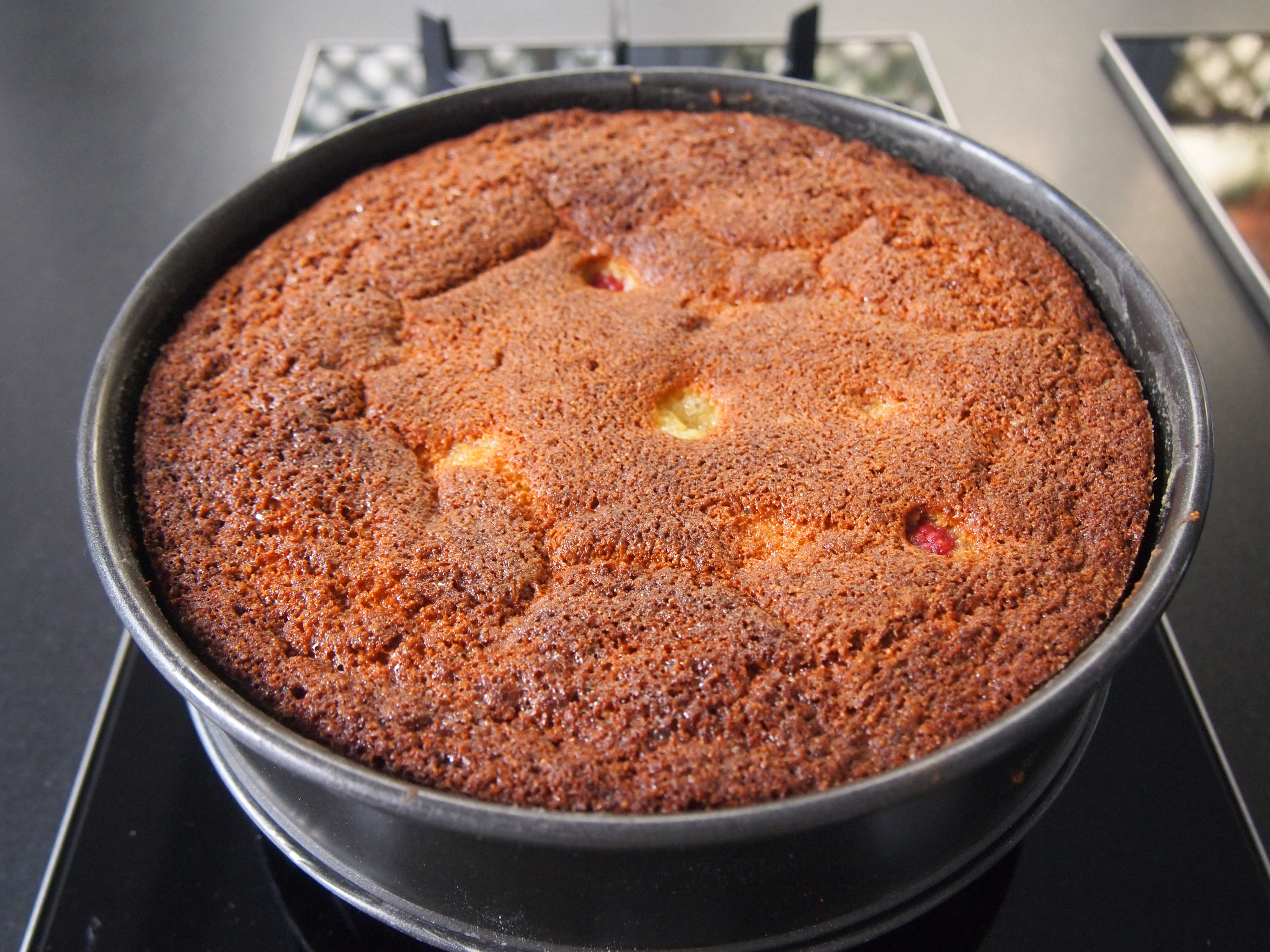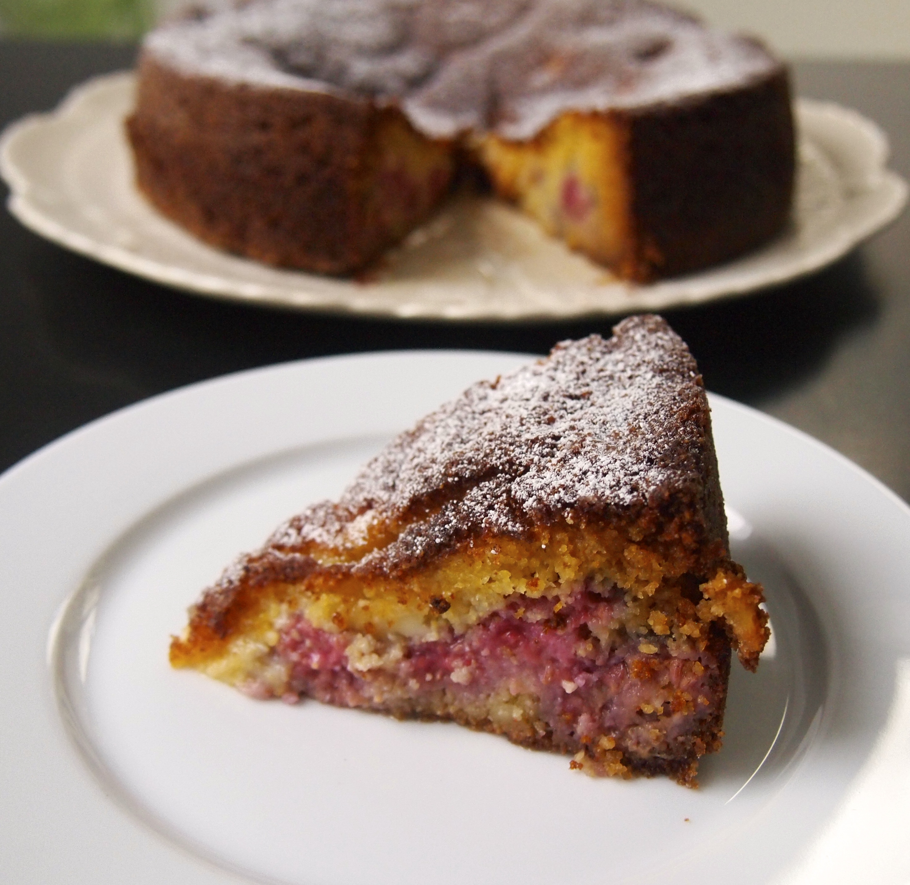 I’ve never had the opportunity to sample the delights of the Village bakery in LA, which isn’t surprising as I live on the other side of the world, but Adam Roberts of the Amateur Gourmet blog is fortunate enough to have the Village Bakery as his local cafe. He loved their berry ricotta cake so much they agreed to give him the recipe and he in turn was kind enough to share it. This is a lovely and moist cake with a very interesting crumb due to the inclusion of cornmeal. I substituted with polenta as cornmeal is hard to come by in Australia and from what I can gather they’re pretty much the same thing. I used a course ground polenta which I think is the most similar in texture to cornmeal. At first bite the mouth feel of the cornmeal/polenta takes you by surprise but in a very enjoyable way and the addition of ricotta places this cake somewhere between a cheesecake and a normal yellow cake. This is an easy cake to pull together and would be great as both a dessert with a dollop of creme fraiche or just to go alongside a cup of tea or coffee.