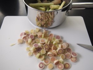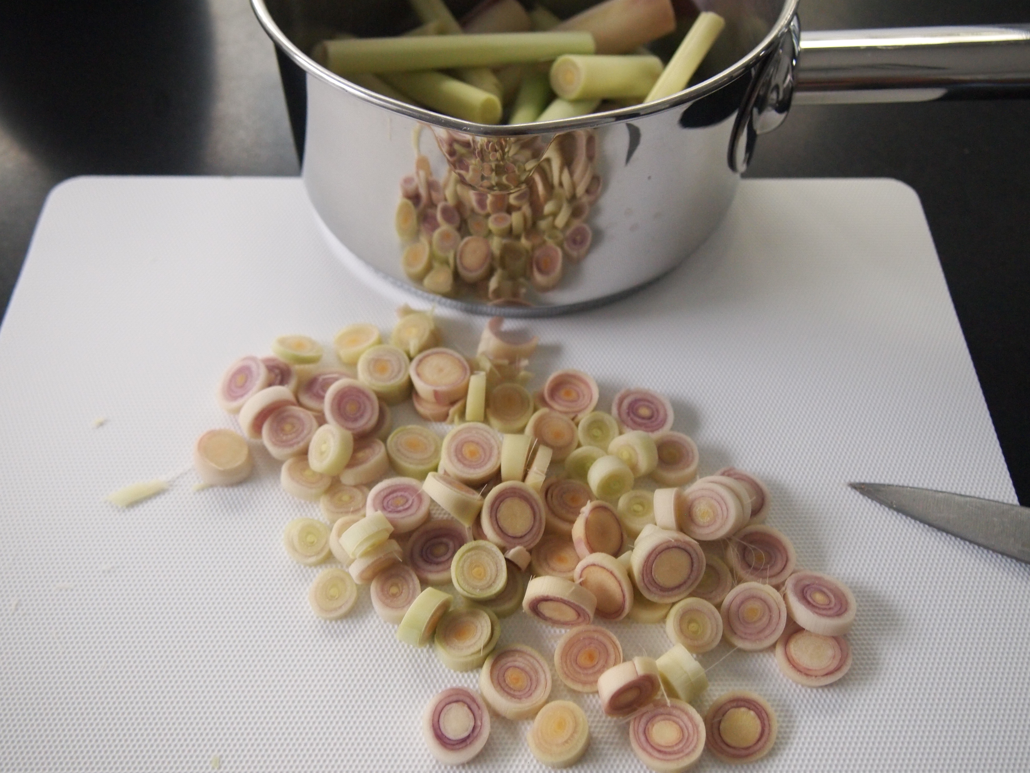 4 lemongrass – base and tough upper tops trimmed and outer leaves removed but reserved for the syrup