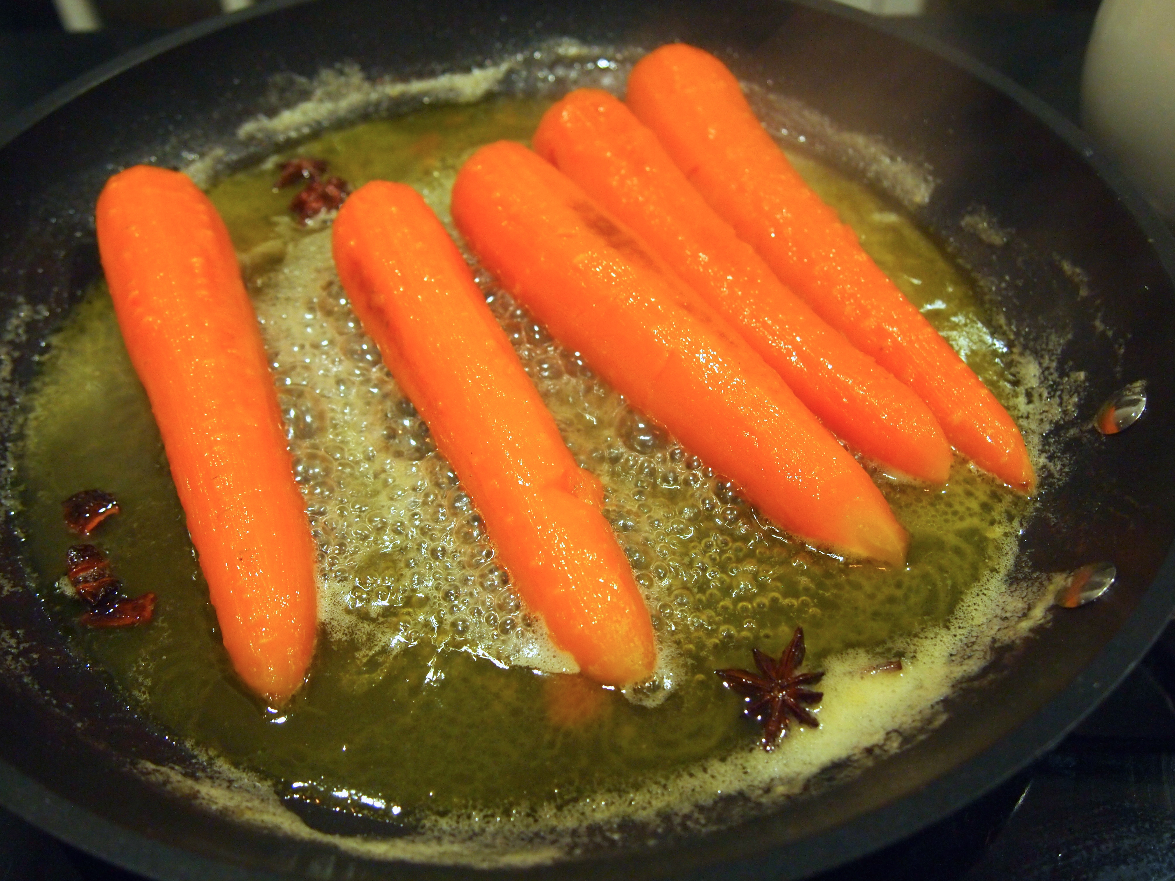 Use a clean scourer to smooth the carrots and remove any peel marks (optional). In a pan combine 300ml of water, the butter, sugar, salt and star anise. Bring to the boil, then reduce the heat to a gentle simmer and add the carrots.