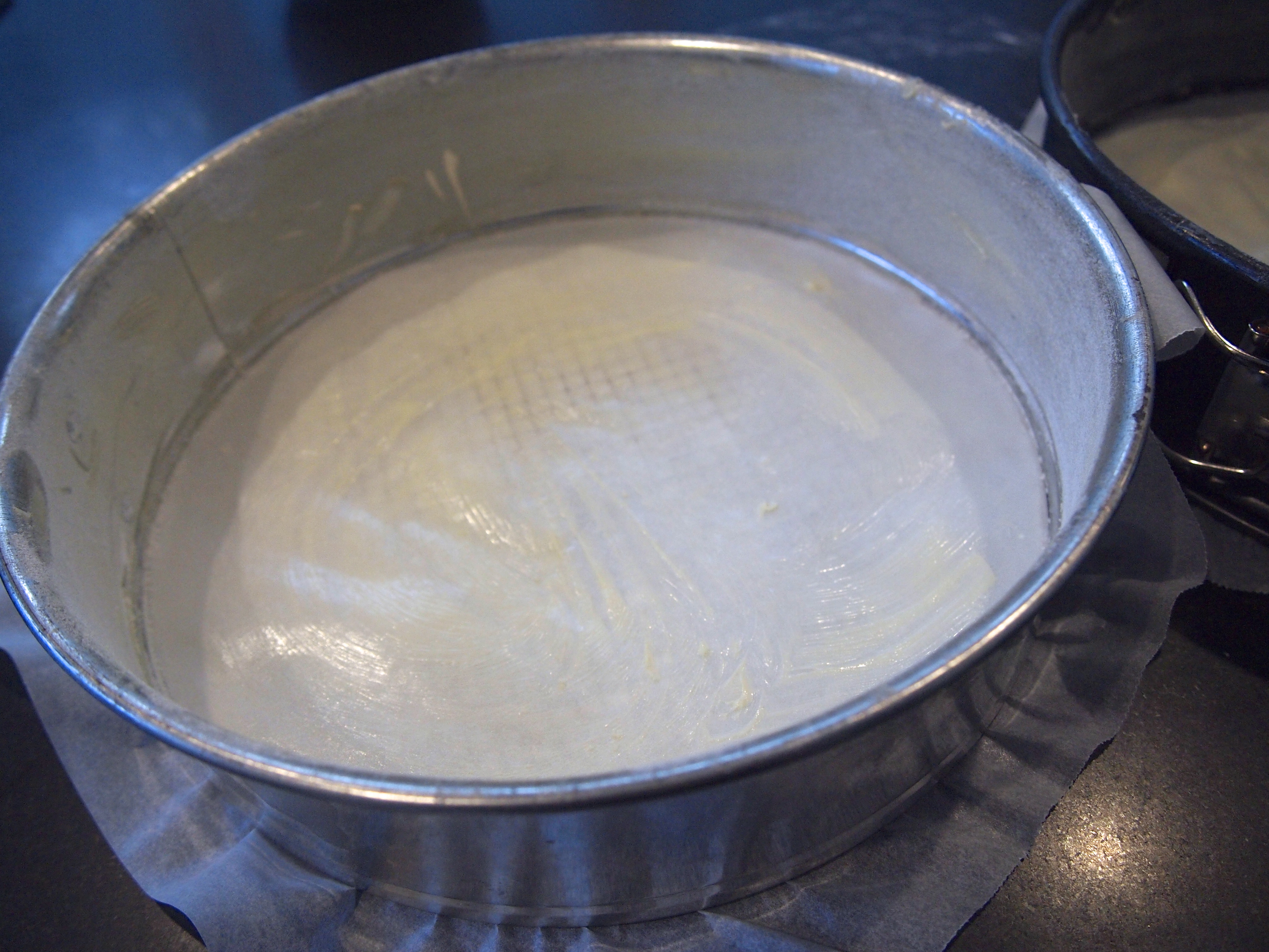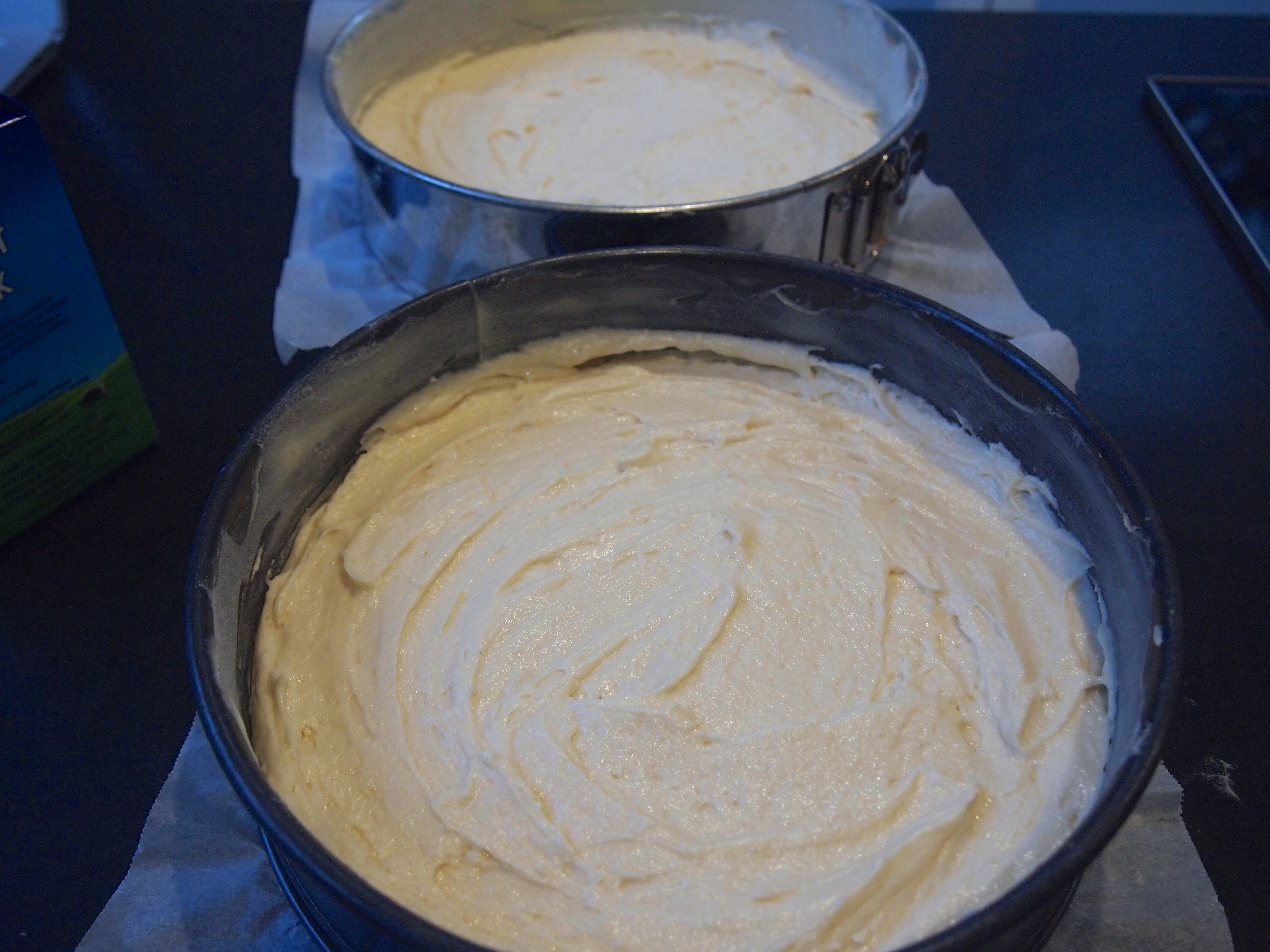 Butter and flour the cake tins and line the bottoms with baking paper. Divide the batter evenly between the pans. Drop each pan from about 3-inches onto the counter to minimize air bubbles while baking.