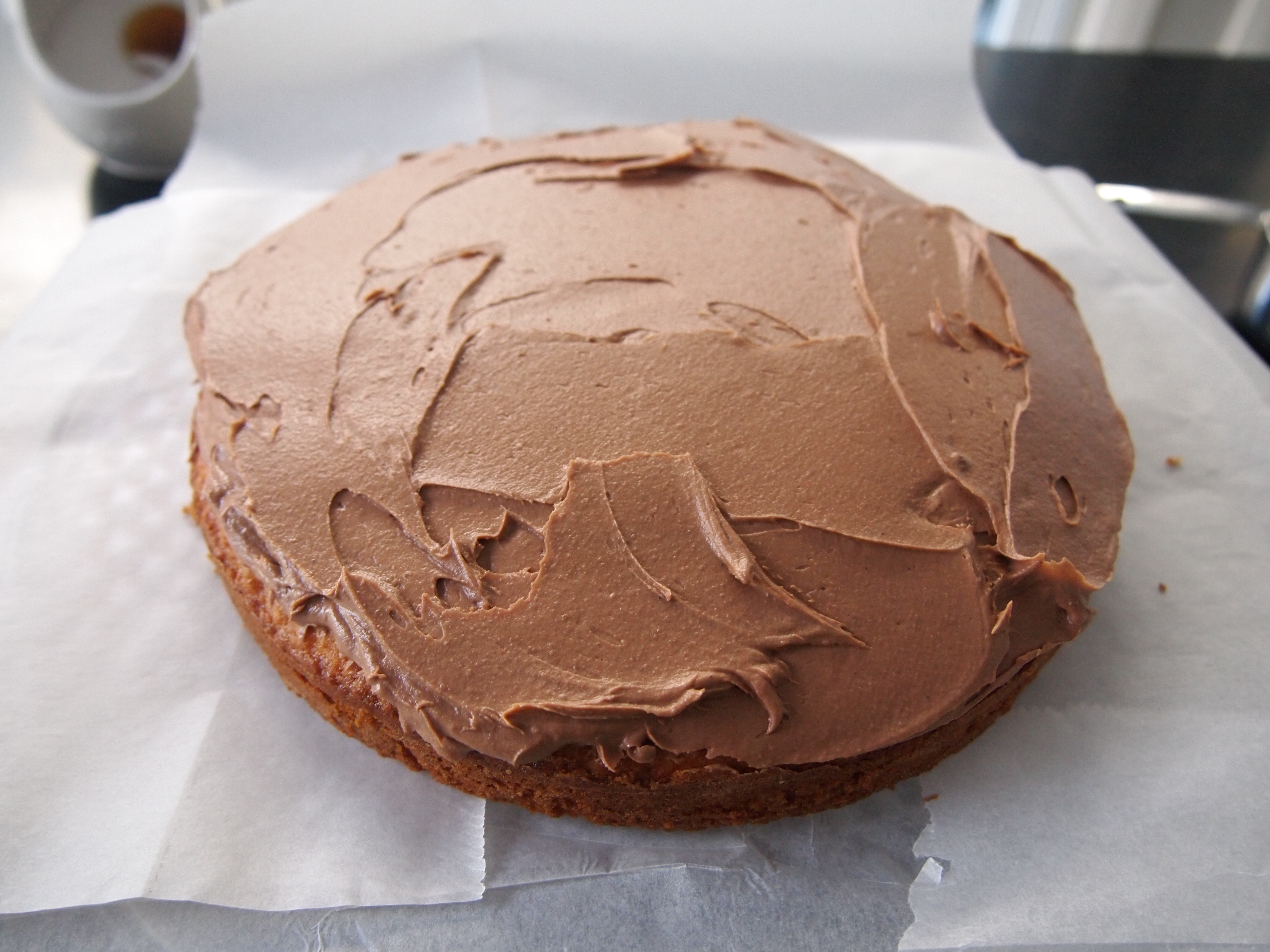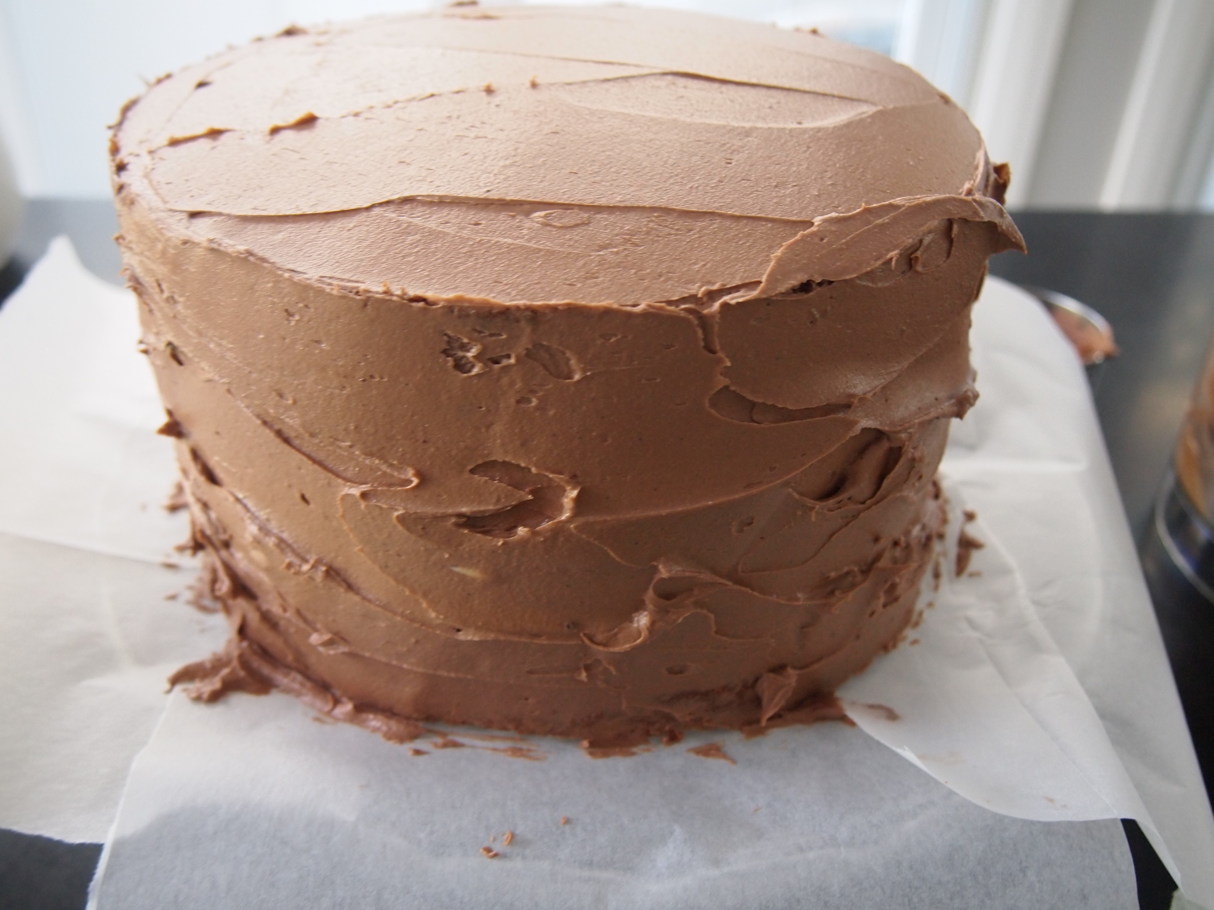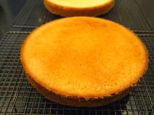 Add a generous amount of frosting on the cake and using a pallet knife work it to the edges and smooth it so it is an even layer. Don’t worry about getting some on the sides of the cake. Place the next layer of cake on top and cover with frosting as before. For the final layer cover with frosting as before but this time add slightly more of the mixture and work some of the frosting down the sides of the cake.