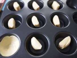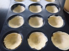 Place the two sheets of pastry on a floured surface one on top of the other, then roll the pastry as tightly as possible into a roll, brushing it from right to left with water as you go. Cut the pastry roll into 12 x 2cm thick discs. Place the discs in the holes of a muffin tin and massage them with a circular motion using a wet thumb, until the pastry rises up the sides of the holes in the tray. Make sure you don’t make any holes in the pastry.