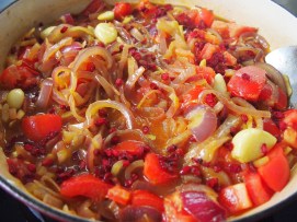 Pre-heat the oven to 160C. In a large oven proof baking dish (I use a shallow Le Creuset) heat a couple of tablespoons of oil over medium heat and when hot add the onions along with a pinch of salt. Cook until the onions are soft. Add the garlic and ginger and cook for another couple of minutes. In a small bowl combine all the dry spices, other than the saffron. Add half the spice mixture to the onions, stir well and cook for a minute. Add the tomatoes and one tablespoon of the honey and cook until the tomatoes have softened a little, about 5 minutes.