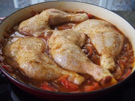 Cover the pan with a tight fitting lid or foil, place in the oven and cook for 2 hours. After this time remove the lid/foil and raise the temperature to 200C and cook for a further 30 minutes. Whilst the chicken is cooking heat a tablespoon of oil in a small skillet over gentle heat. Add the remaining barberries and ½ teaspoon of sugar and cook until the sugar has melted and the barberries and glistening and warm. Remove the chicken from the oven and sprinkle over the sautéed barberries. Serve straight from the pan with steamed rice or cous cous.