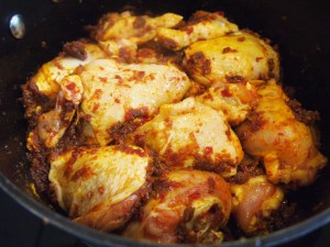 When the paste has been cooked increase the heat and add the chicken toss and stir the chicken until it is well coated in the paste and cook until it just starts to change colour.  The add the water, coconut milk, brown sugar, stock cube and lime leaves. Bring to a simmer and cook over a gently heat, partially covered for a good hour and 15-20 minutes. If you have used boneless chicken pieces you probably only need to cook for 1 hour.