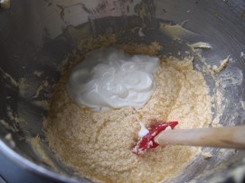 Next, beat in the orange juice and zest and the ground cardamom. Add the eggs one at a time, beating well between each addition, then mix in the yogurt. Next sift in the flour, baking powder and salt, folding in just until combined.