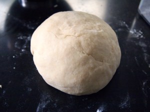 Pour the flour, sugar and salt into butter mixture and mix. Add egg and mix for a few minutes. If dough is very sticky, add a drop more flour. Shape dough into ball and place into an oiled bowl. Cover and let rise in a warm spot for an hour. Meanwhile, combine the filling ingredients (excluding the butter) and grease a 9-inch round pan.