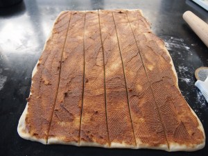 On a lightly floured surface, roll out the dough into a rectangle about a 1/4-inch thick. Spread softened butter evenly all over dough, including edges. You can put the butter in the microwave for a few seconds till it gets to an almost melted stage to make the spreading easier. Sprinkle filling evenly on top of dough.