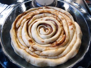 Using a pizza cutter, slice dough (vertically – the long way) into 6 even strips. Loosely roll up the first strip and place it into the center of the greased pan. Wrap/coil the next strip around the roll in the center (don’t roll it into itself like you did the first strip), starting at the spot where the previous coil ended so you achieve the look of one continuous spiral. Repeat with the rest of the strips. The spiral should fill up almost the whole pan at this point.