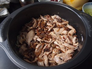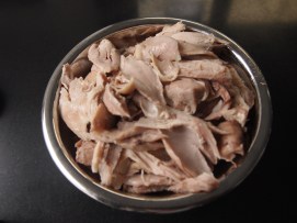 Place the chicken marylands into a saucepan along with the carrot and roughly chopped onion and 2 teaspoons of salt. Add enough cold water to just cover the chicken. Bring to a boil over medium heat, skimming any scum from the surface. Lower the heat to a gentle simmer and cook partially covered for an hour, Once cooked remove the chicken, reserving the stock. When the chicken is cool enough to handle remove the meat from the bones, discarding the skin and shred into large chunks.