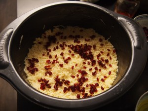 Tahchin is a much loved Persian comfort food but despite it’s popularity and wonderful flavour it’s a recipe a lot of people tend to steer away from as it’s perceived as being difficult to execute well. This is however not at all true and tahchin, I believe, is one of the easier Persian recipes to master. One of the best things about a well made tahchin is the wonderful crunchy crust that encases the rice and chicken, and it’s achieving this golden crust that seems to scare most people off, but even if the crust doesn’t come out quite as crunchy or golden as you would like the taste and flavours of the chicken, yogurt and saffron rice will still be sublime. There’s no real secret to making a great tahchin and a successful outcome has as much to do with method as it does about the cooking vessel used. I prefer to use a deep metal, non-stick, cake tin (not spring form) or a two handled heavy bottomed non-stick pot that is not too deep or too wide. I know a lot of cooks who favour pyrex dishes but I have found you’re more likely to achieve crunchy tahdig-heaven using a metal dish.