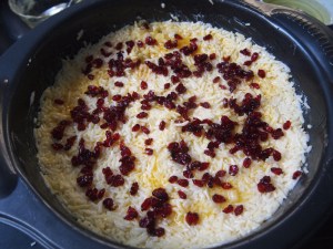 Heat a generous amount of oil or ghee in a frypan and cook the onions along with a pinch of salt until they are golden brown and caramelised. Set aside. In the same pan melt a tablespoon of butter and gently saute the barberries with the sugar for a few minutes, set aside. Beat the egg yolks with the saffron liquid then add the yogurt, along with 1 tablespoon of melted butter and a pinch of salt and mix well. Place the rice in a large bowl and add the yogurt mixture and mix throughly but gently until well combined.