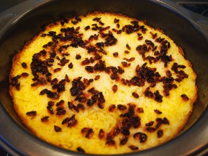 Heat the oven to 200C. Butter or oil your cooking vessel well – as stated above I prefer a metal non-stick dish and in this instance I used a cake tin (not spring form). You could also use a deep skillet or a pyrex casserole dish. Add half the rice mixture to the tin. Even it out and press down firmly. sprinkle with half the barberries. Mix the chicken meat with the caramelised onions and a few tablespoons of the reserved chicken stock. Place the chicken mixture evenly on top of the rice. Spread remaining rice on top of the chicken. Again press down firmly. Sprinkle over the rest of the barberries. Cover with foil and bake for 20 minutes. Lower heat to 160C and cook for a further hour. Remove from the oven and let it sit undisturbed for 10 minutes before removing the foil and inverting the tahchin onto a large plate. Serve by cutting into wedges.