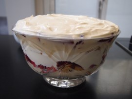 Arrange half of the sponge over the base of a 3 litre serving bowl and top with half of the custard, half the strawberries and peach slices, half of the jelly and half of the cream. Repeat in the same order until your serving bowl is filled and a layer of cream is on top.