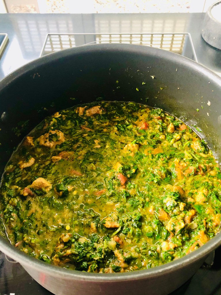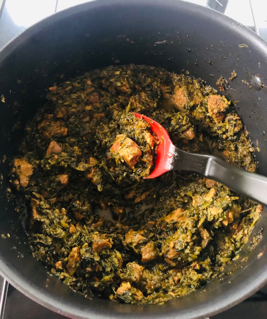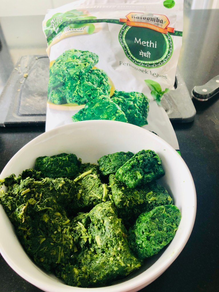 Once your meat is half cooked remove the lid and add the defrosted fenugreek and spinach. Once the green have been added you don’t want to cover it again as it will lose it’s vibrant colour. Continue simmering, uncovered, for a further hour or so or until your meat is completely tender, probably another 45 minute to an hour. If you find your pan is running dry add a little bit of boiling water and if your curry is to thin you can increase the heat to reduce the sauce. Best served with basmati rice, raita and naan.