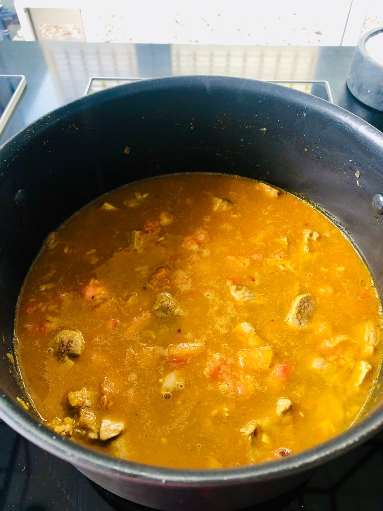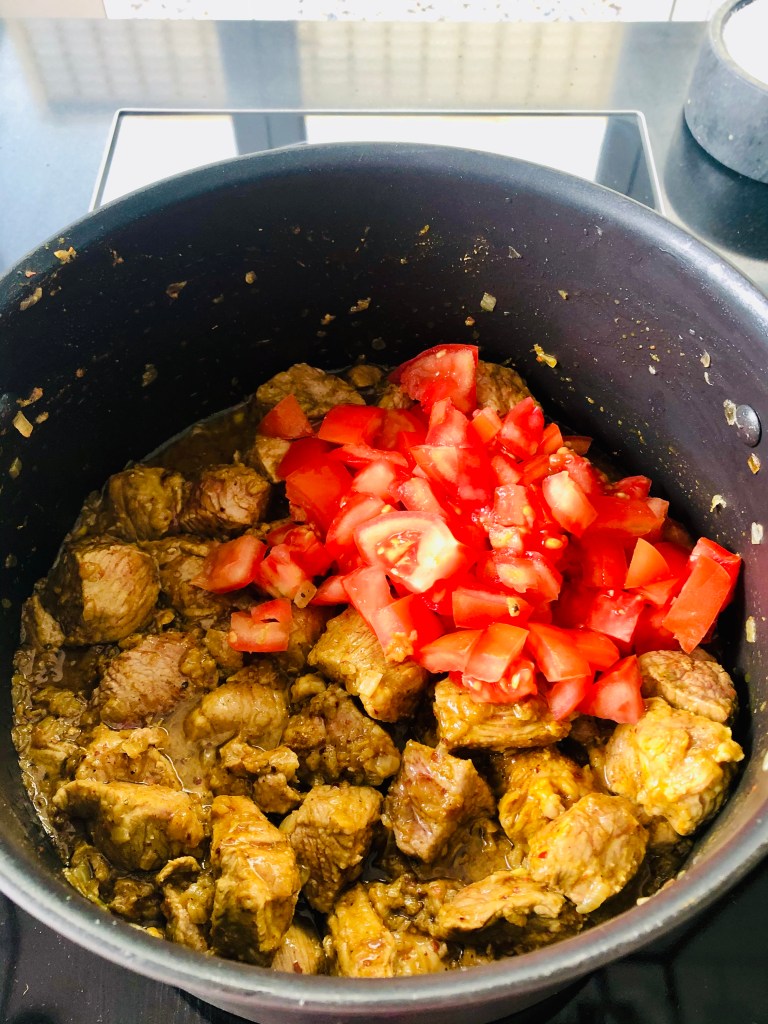Turn up the heat and add the lamb and cook stirring until it has changed colour add a teaspoon and a half of salt and stir again. Add the tomatoes and cook until they have wilted slightly which should only take about 5 minutes. Bring a kettle to the boil and add enough boiling water so as just the tips of the meat are uncovered. Bring to a boil, and then lower the heat to a gentle simmer. Cover and cook until your meat is half cooked about an hour to an hour and a half, depending on the cut of meat.