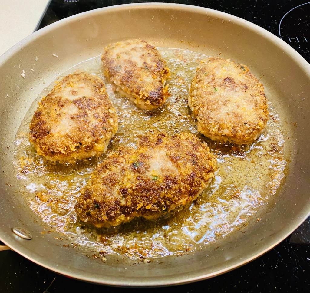To fry the kotlet place a large heavy potted non stick fry pan over medium heat. Once hot add a generous amount of oil – enough to cover the bottom of the pan well. Wait until the oil is hot and add the kotlet to the hot oil. Make sure not to over crowd the pan and that your heat isn’t too intense. Cook for about 4-5 minutes per side or until golden brown, if your heat is too high they will brown too quickly without coking through to the middle. Continue cooking until all the Kotlet are done. As the kotlet are cooked I like to put them on an oven tray and place them in a 120C oven, this not only keeps them all warm but also aids in finishing off the cooking process. Serve hot.