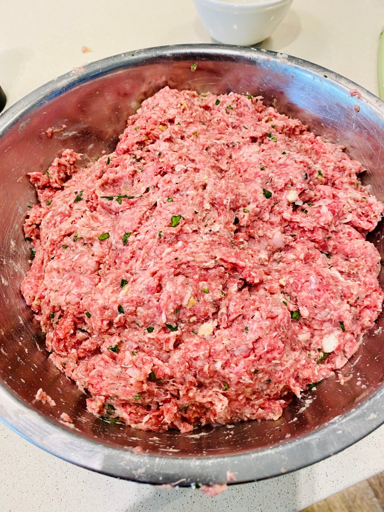 Place the bread and milk in a bowl and mix it well to ensure that all the bread is coated. Let sit for 15 minutes then squish it all up very well in your hands so as you have a mushy looking mixture, if there is excess liquid, drain it off. To a large bowl add the egg, bread mixture, grated onion, parsley, 2 teaspoons of salt and half a teaspoon of black pepper. Combine this mixture very well. I like to put on disposable gloves and do this by hand. Once the mixture is combined add the meat and again work it all together. This is best done with your hands. Give it a good knead for at least a couple of minutes. At this point I like to cover the bowl and refrigerate it. You can do this overnight but just 20 minutes is enough. But if you are short of time you can just proceed straight to shaping them.