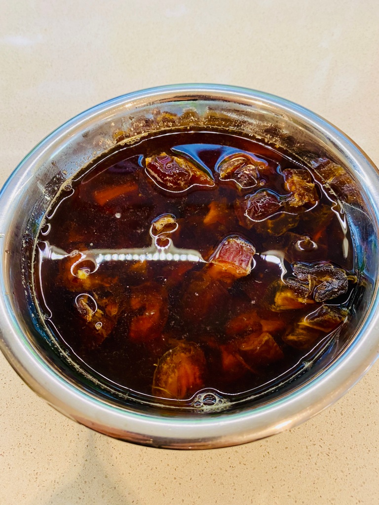 Place coursely chopped dates in a large mixing bowl. Sprinkle with baking soda and cover with boiling-hot black tea. Set aside for 1 hour for dates to soften and cool.